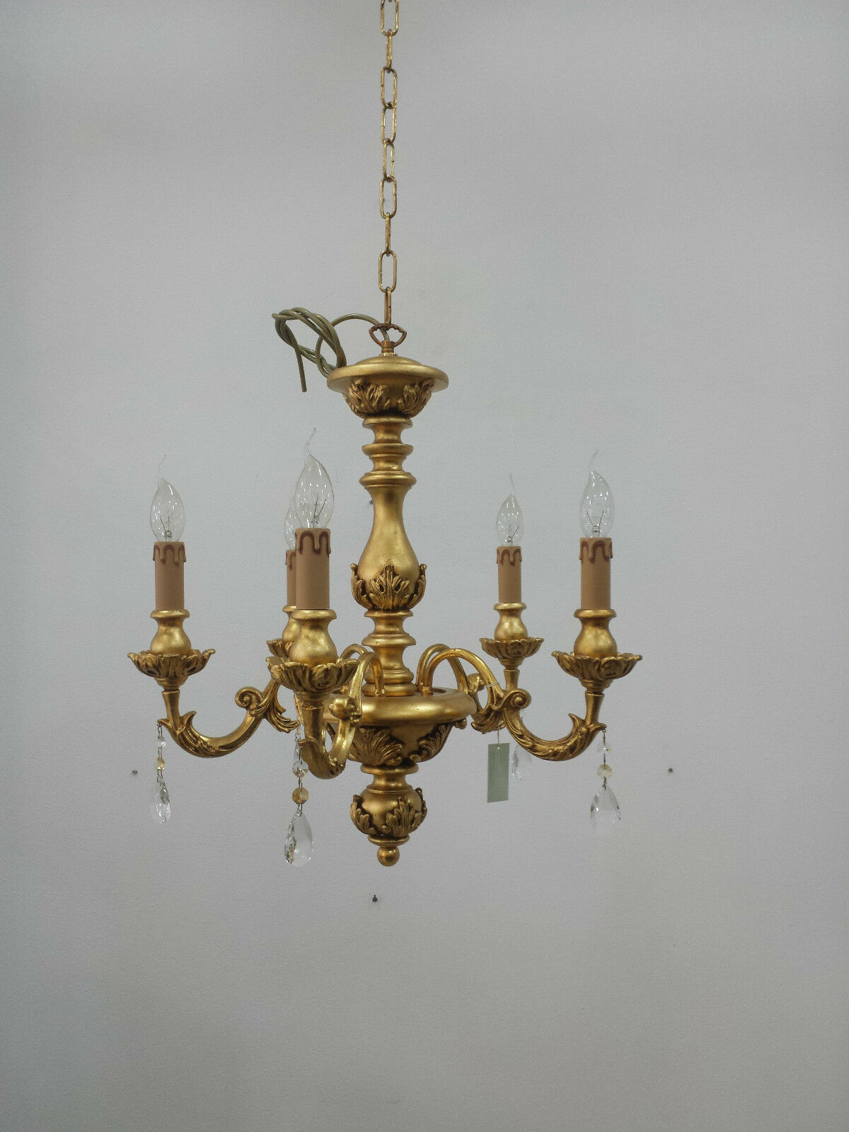 LAMPADARIO LEGNO FOGLIA ORO LAMPADA SOFFITTO PLAFONIERA SOSPENSIONE 5 LUCI