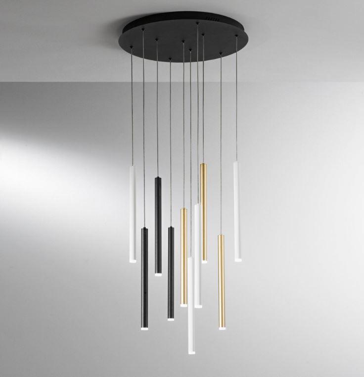 Sospensione con struttura tubolare in metallo disponibile nelle versioni singole bianco, nero e oro spazzolato o multipla che comprende tutte le declinazioni