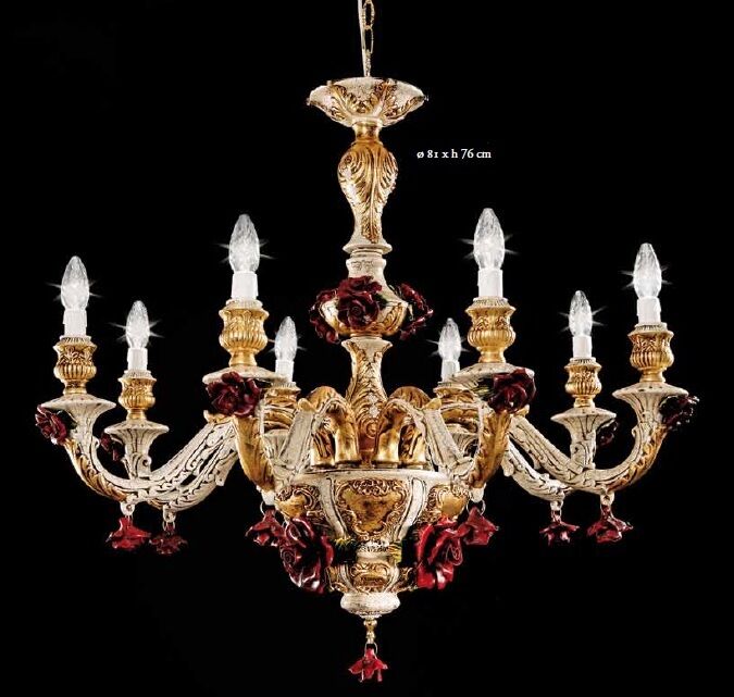 LAMPADARIO SOSPENSIONE IN CERAMICA AVORIO E ORO CON ROSE ROSSE 8 LUCI