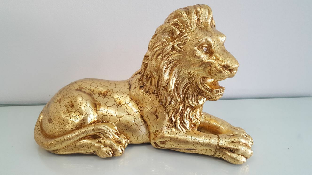 LEONE PICCOLO SDRAIATO IN CERAMICA FOGLIA ORO CON OCCHI IN CRISTALLO ARREDO CASA