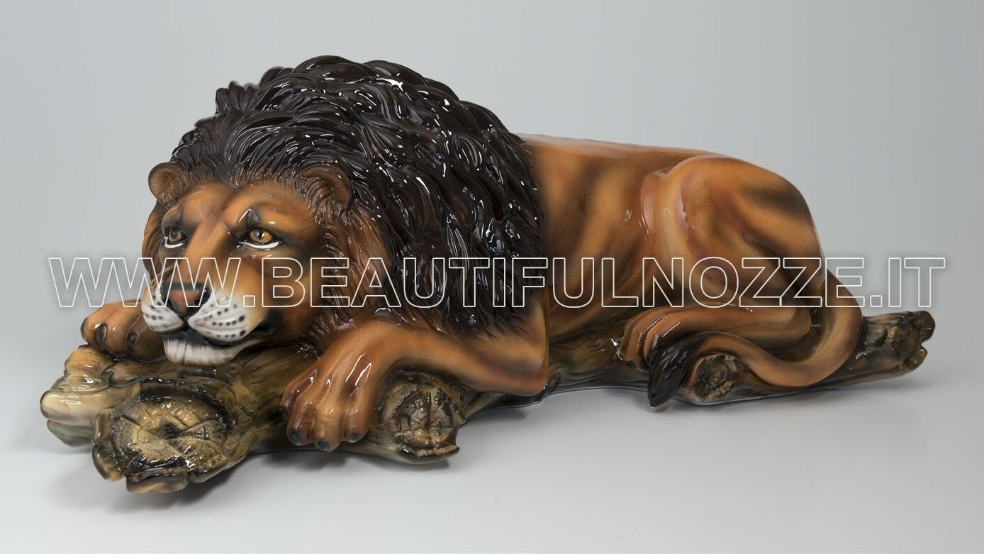LEONE SDRAIATO SU TRONCO IN CERAMICA COLORATA ANIMALI TIGRE PANTERA ARREDO CASA