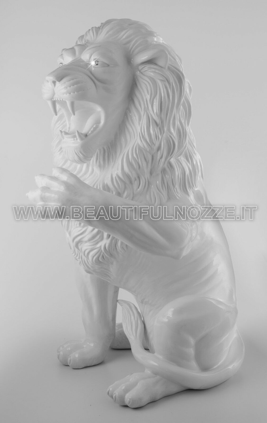LEONE SEDUTO CON ZAMPA SX ALTA IN CERAMICA BIANCO OCCHI IN CRISTALLO SWAROVSKI