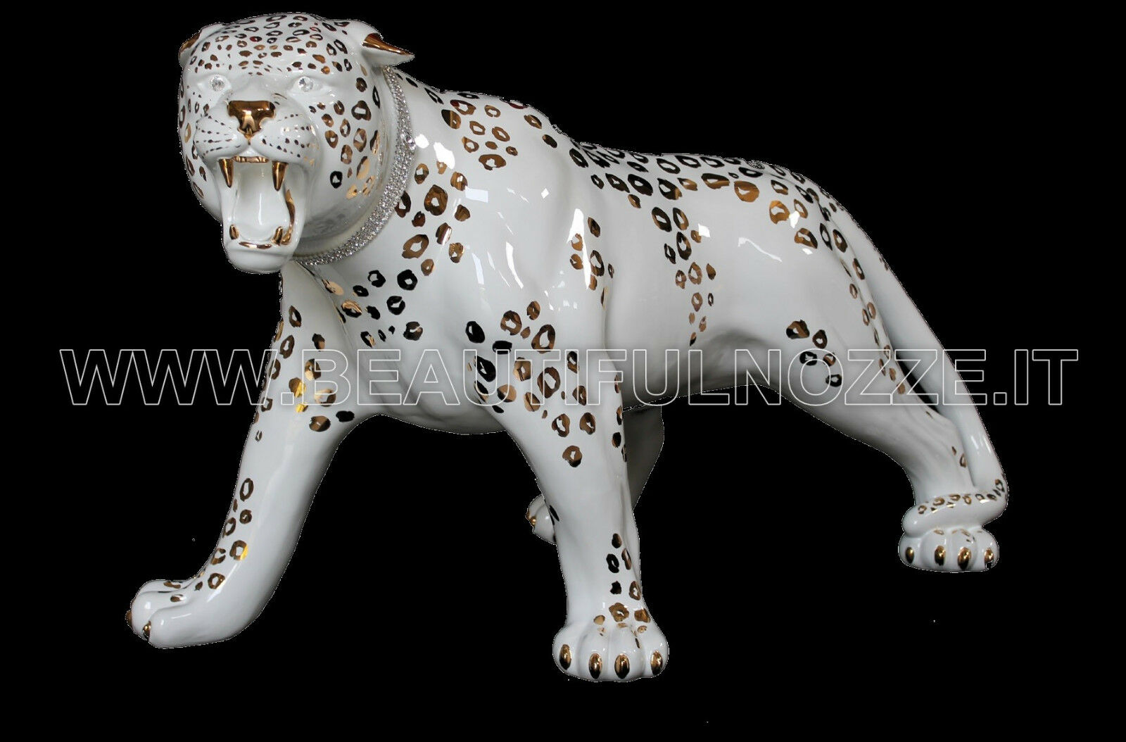 LEOPARDO SAVANA IN CERAMICA BIANCO E ORO CON OCCHI E COLLARE CRISTALLI SWAROVSKI