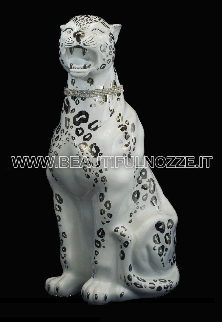 LEOPARDO SEDUTO IN CERAMICA BIANCO PLATINO CON CRISTALLI SWAROVSKI ANIMALI