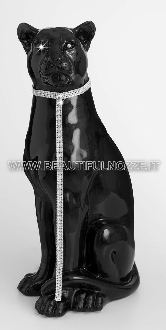 LEOPARDO SEDUTO IN CERAMICA NERO CON OCCHI E COLLARE IN CRISTALLO ARREDO CASA