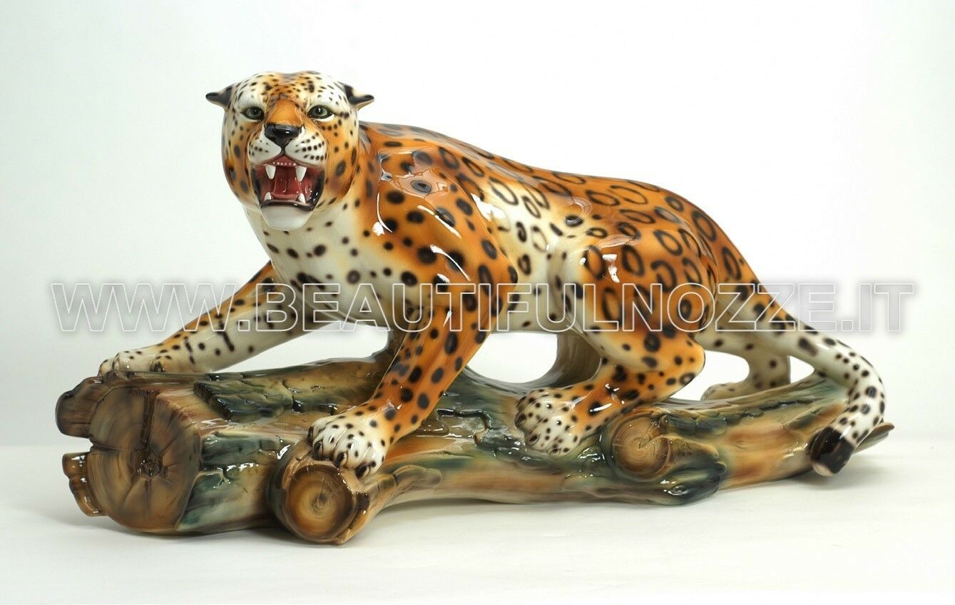 LEOPARDO SU TRONCO IN CERAMICA CON MACCHIE ANIMALI PANTERA LEONE ARREDO CASA