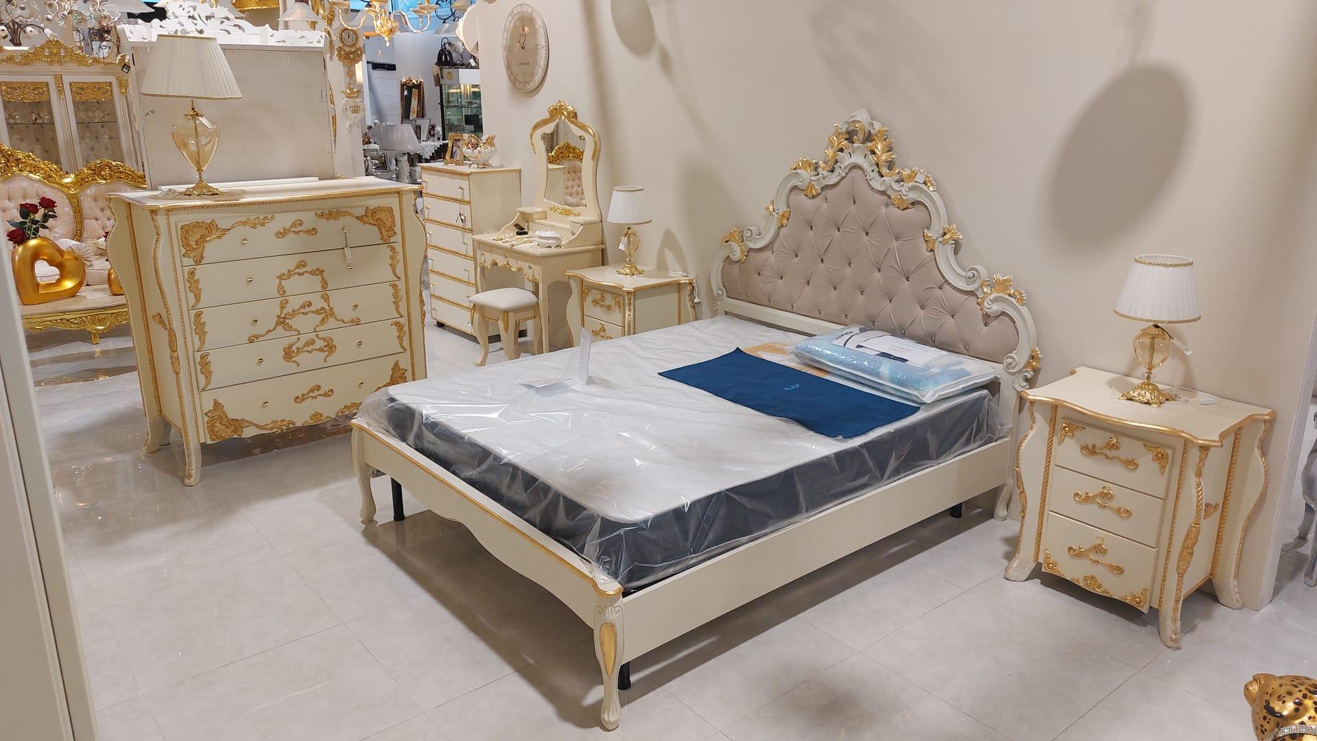 letto matrimoniale barocco in legno avorio e foglia oro con capitonnè in velluto