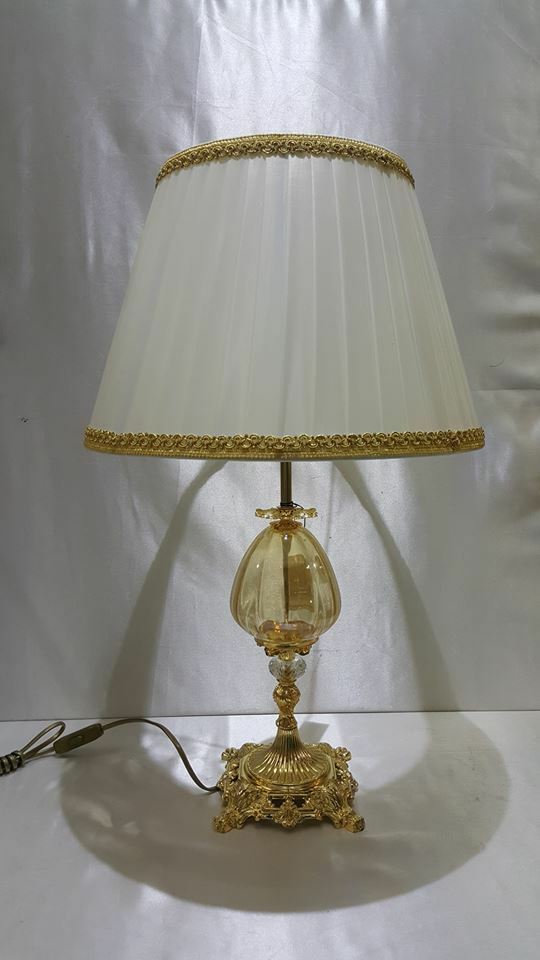 LUME GRANDE IN OTTONE BAGNO ORO CRISTALLI E PARALUME PLISSÈ LAMPADA