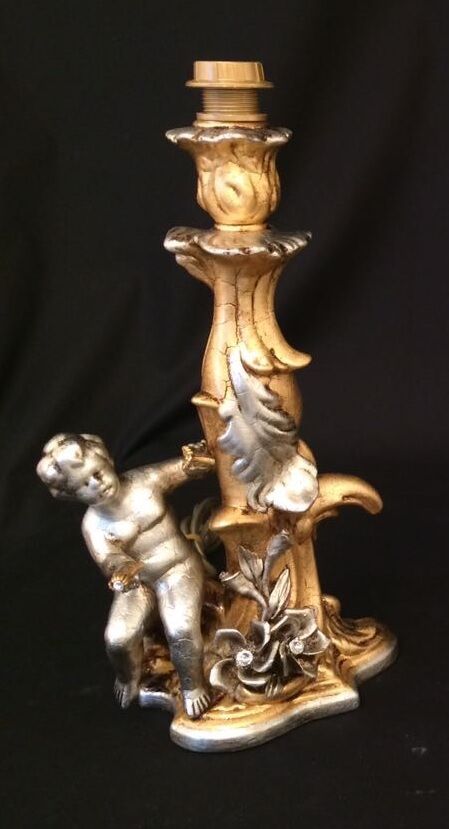 LUME PICCOLO SINISTRO CON ANGELI E ROSE CERAMICA FOGLIA ORO E ARGENTO CRISTALLI
