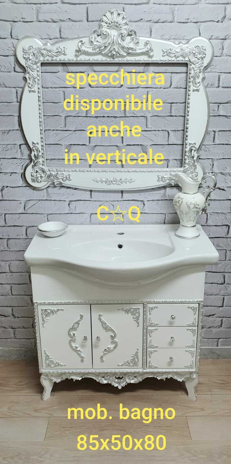 MOBILE BAGNO COMPLETO LAVABO E SPECCHIO LEGNO BIANCO E ARGENTO CON CRISTALLI