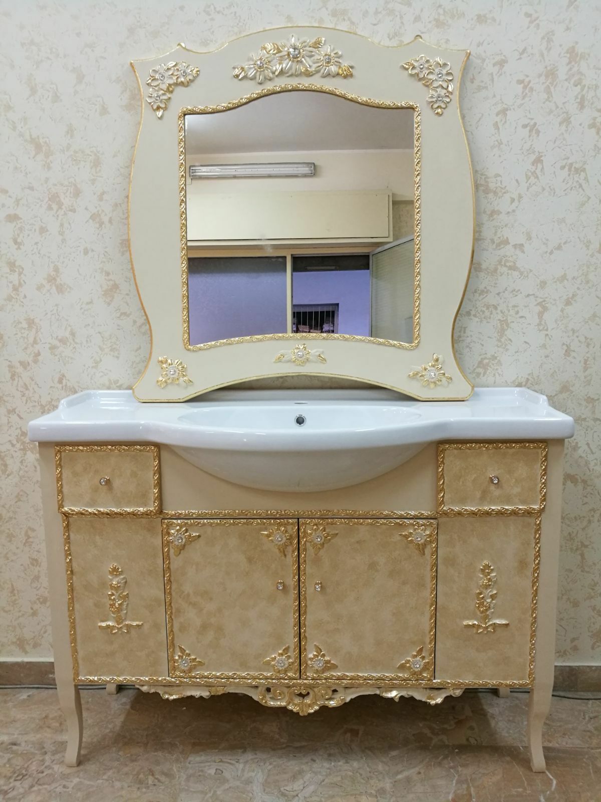 MOBILE BAGNO IN LEGNO AVORIO E FOGLIA ORO CON CRISTALLI