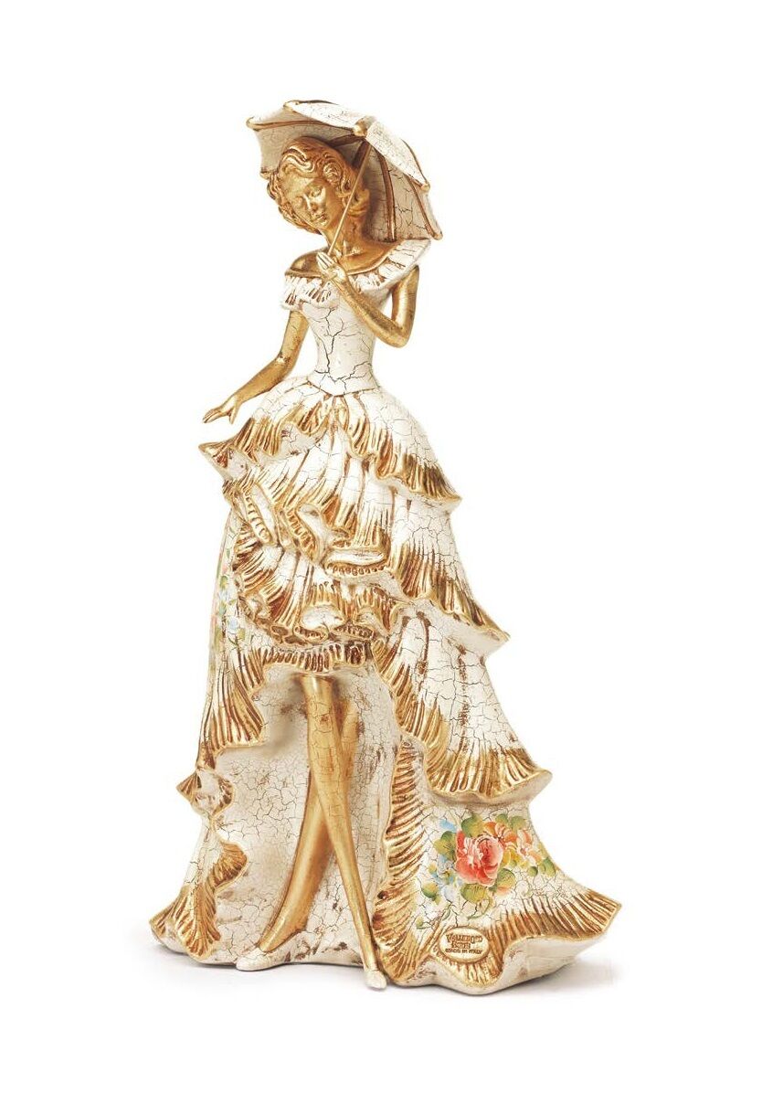 OLANDESINA CON OMBRELLO IN CERAMICA DECORO AVORIO FOGLIA ORO ARREDO CASA