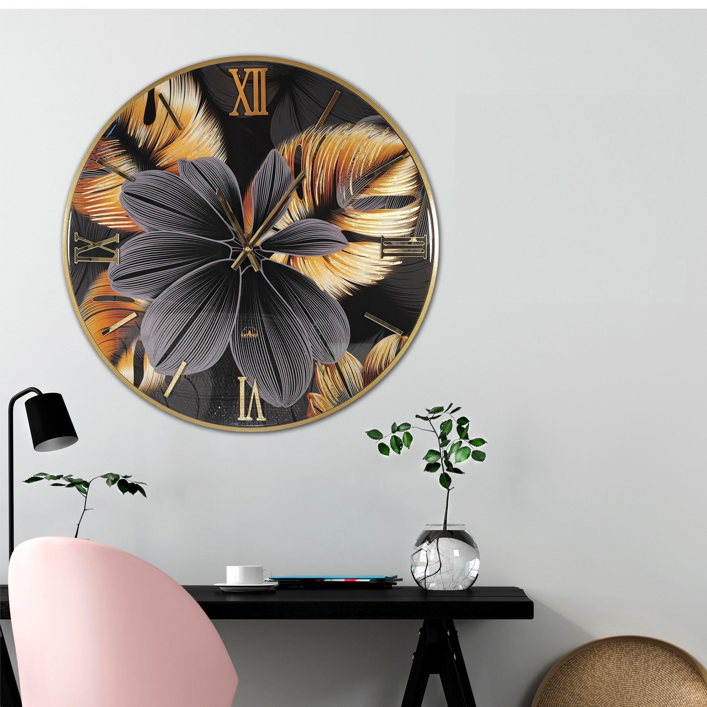 Orologio circolare con quadrante lucido, decorato a mano con foglia oro e numeri sovrapposti in Plex lucido con effetto specchio.