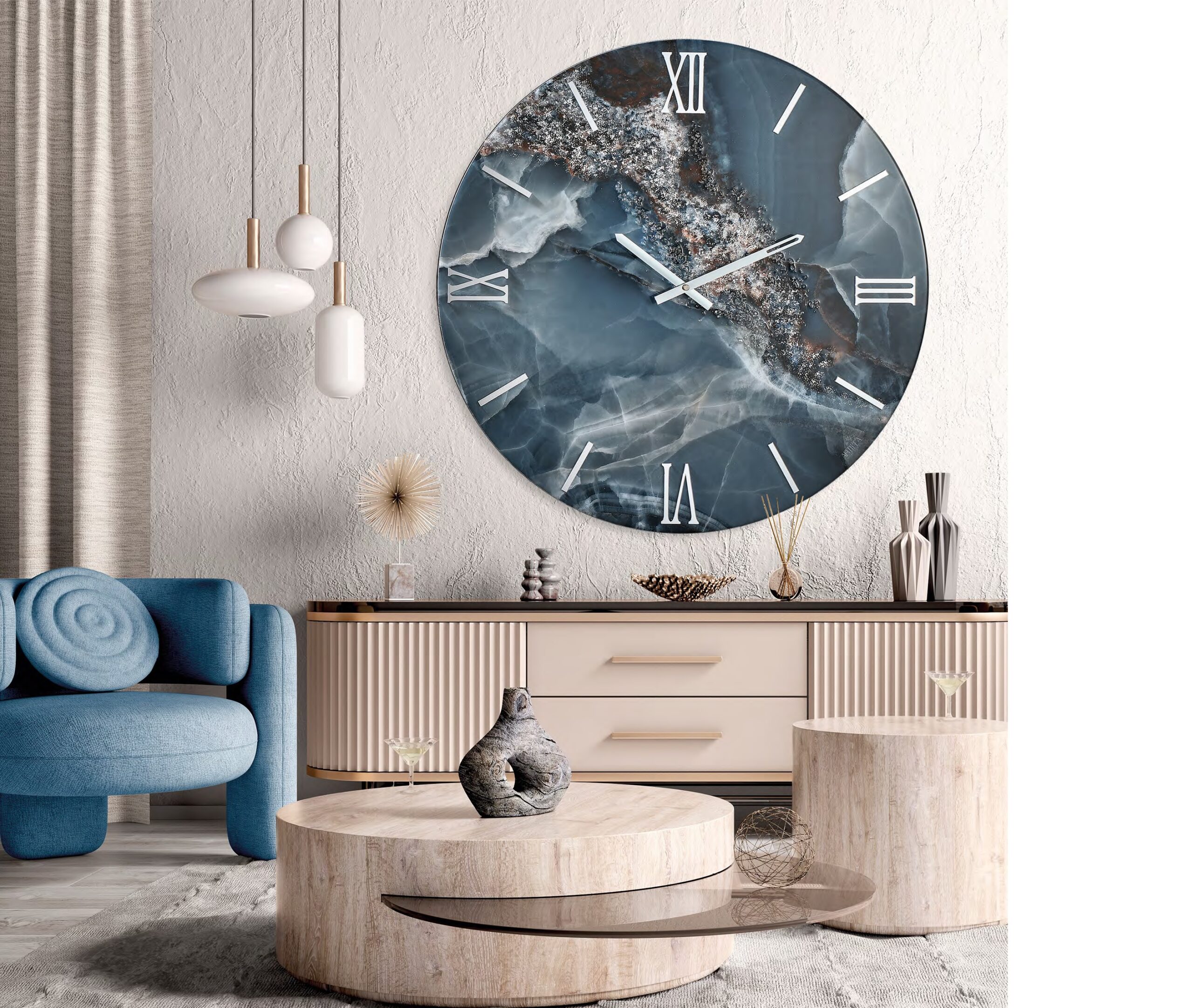 Orologio moderno blu petrolio con cristalli e numeri argento dec. ISIDE varie misure 40-60-80-100 cm
