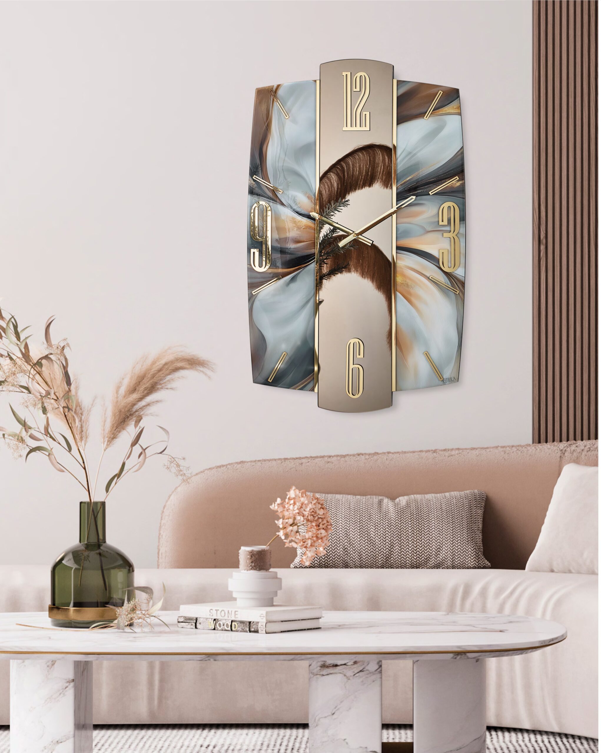Orologio moderno effetto marmo con fascia centrale in specchio bronzo e numeri oro dec. MARTE T mis. 45×74 cm
