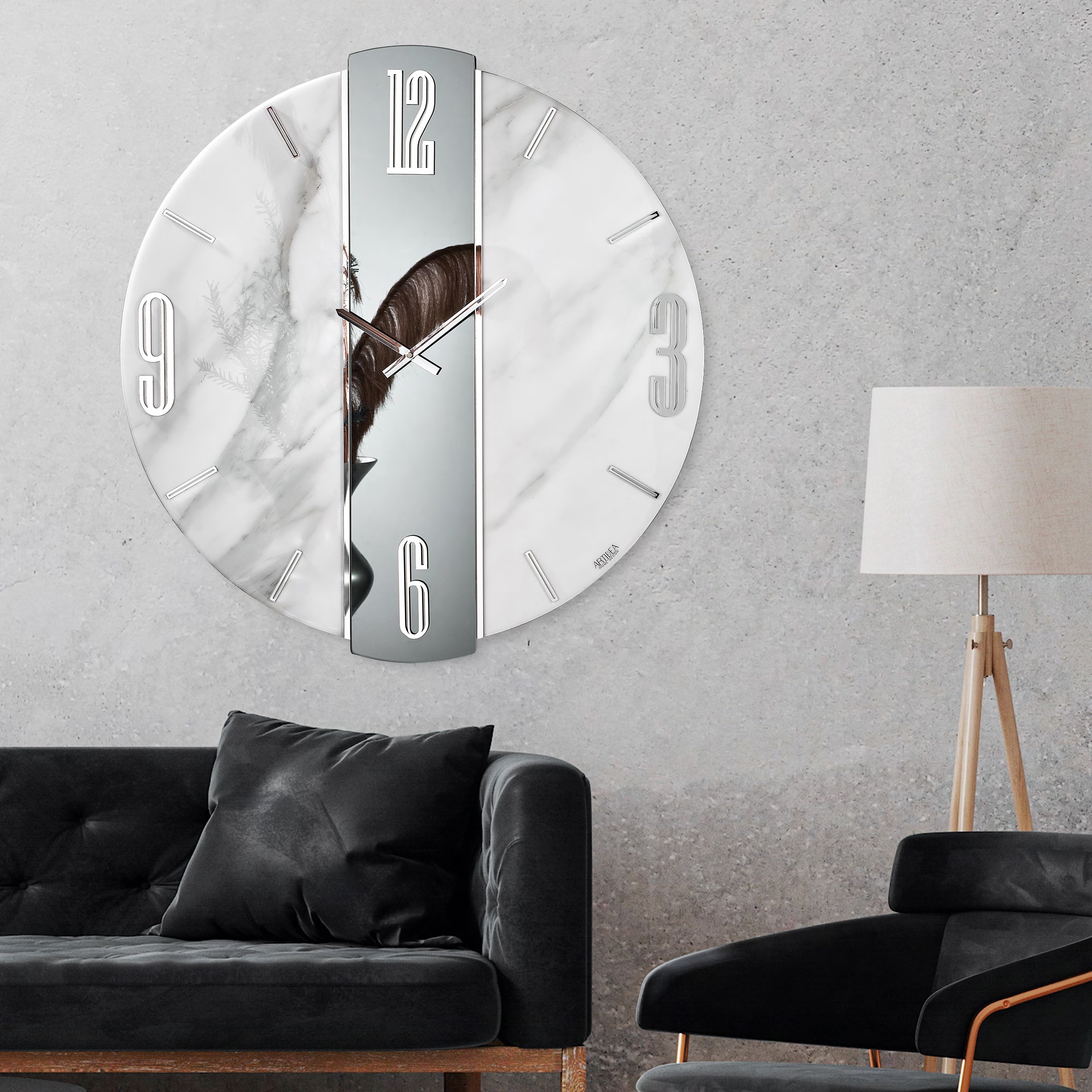 Orologio moderno effetto marmo con fascia centrale in specchio fumè dec. MOON GRIGIO mis. 70×74 cm
