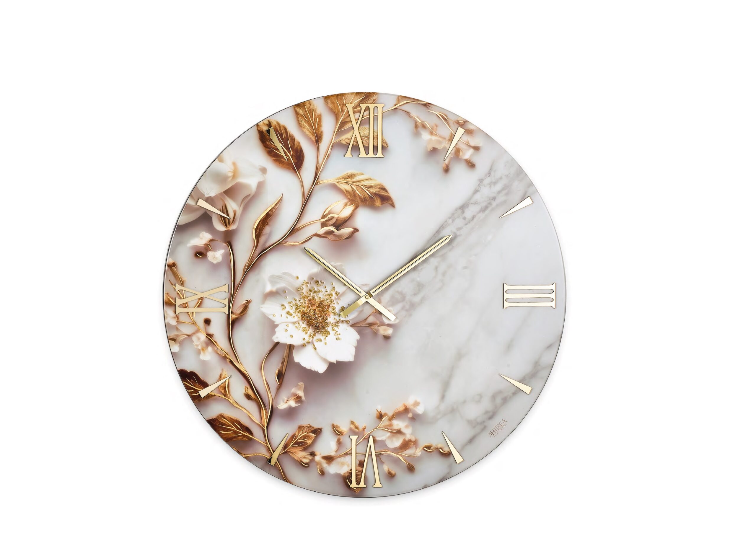 Orologio moderno effetto marmo con fiori oro e numeri oro dec. IRIS varie misure 40-60-80-100 cm