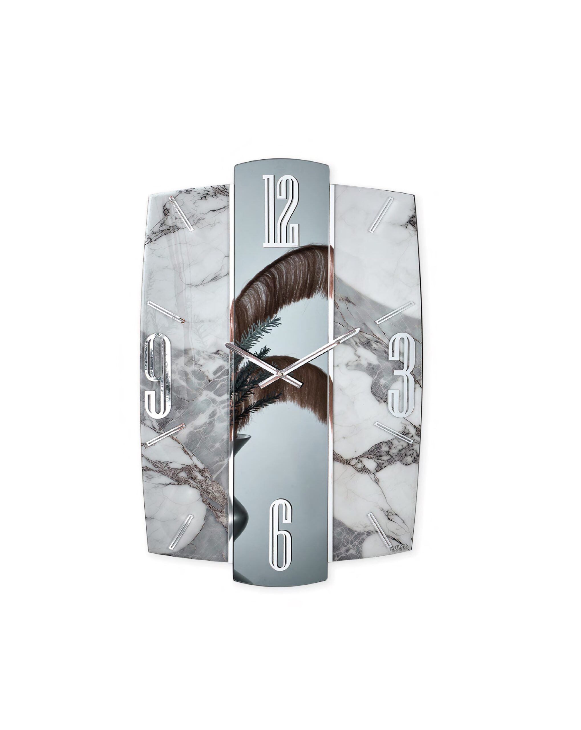 Orologio moderno effetto marmo grigio con fascia centrale in specchio numeri argento dec. MARTE G mis. 45×74 cm