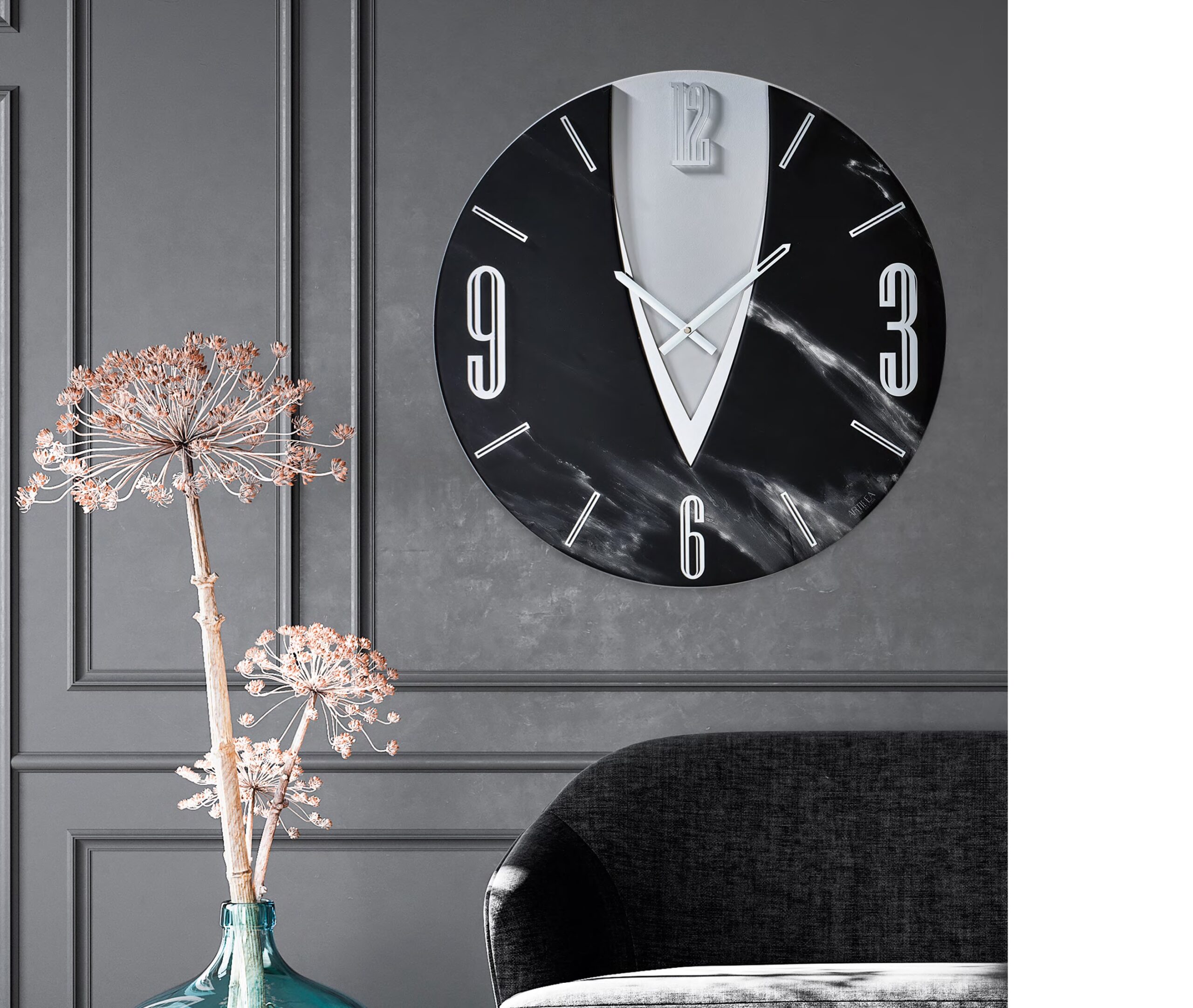 Orologio moderno nero con applicazione grigia sagomata numeri argento dec. MOON NERO mis. 60 cm