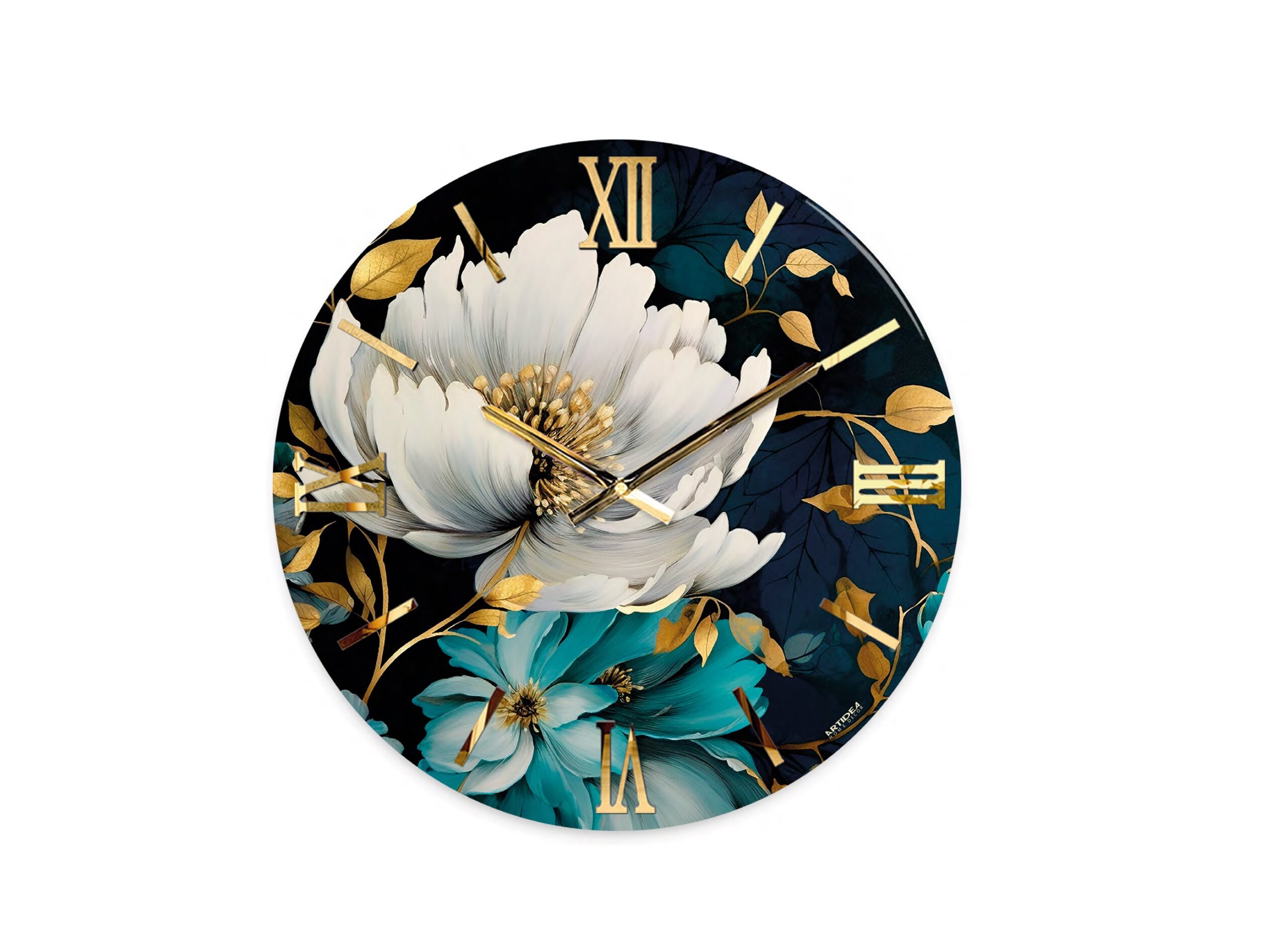 Orologio moderno nero con fiore bianco con cristalli e numeri oro dec. PRIMAVERA varie misure 40-60-80-100 cm
