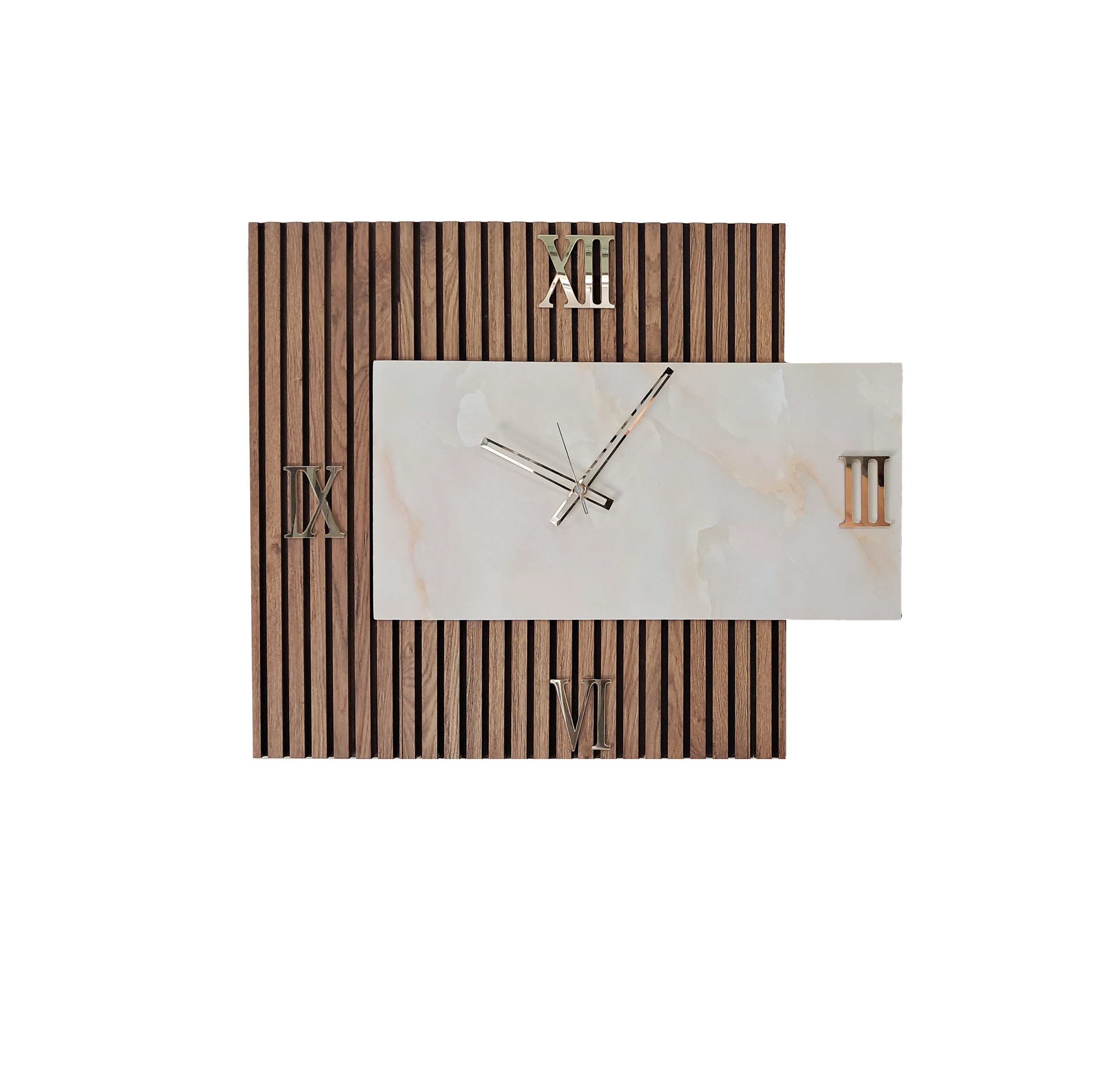 orologio moderno quadrato in legno cannettato marrone con centrale marmorizzato