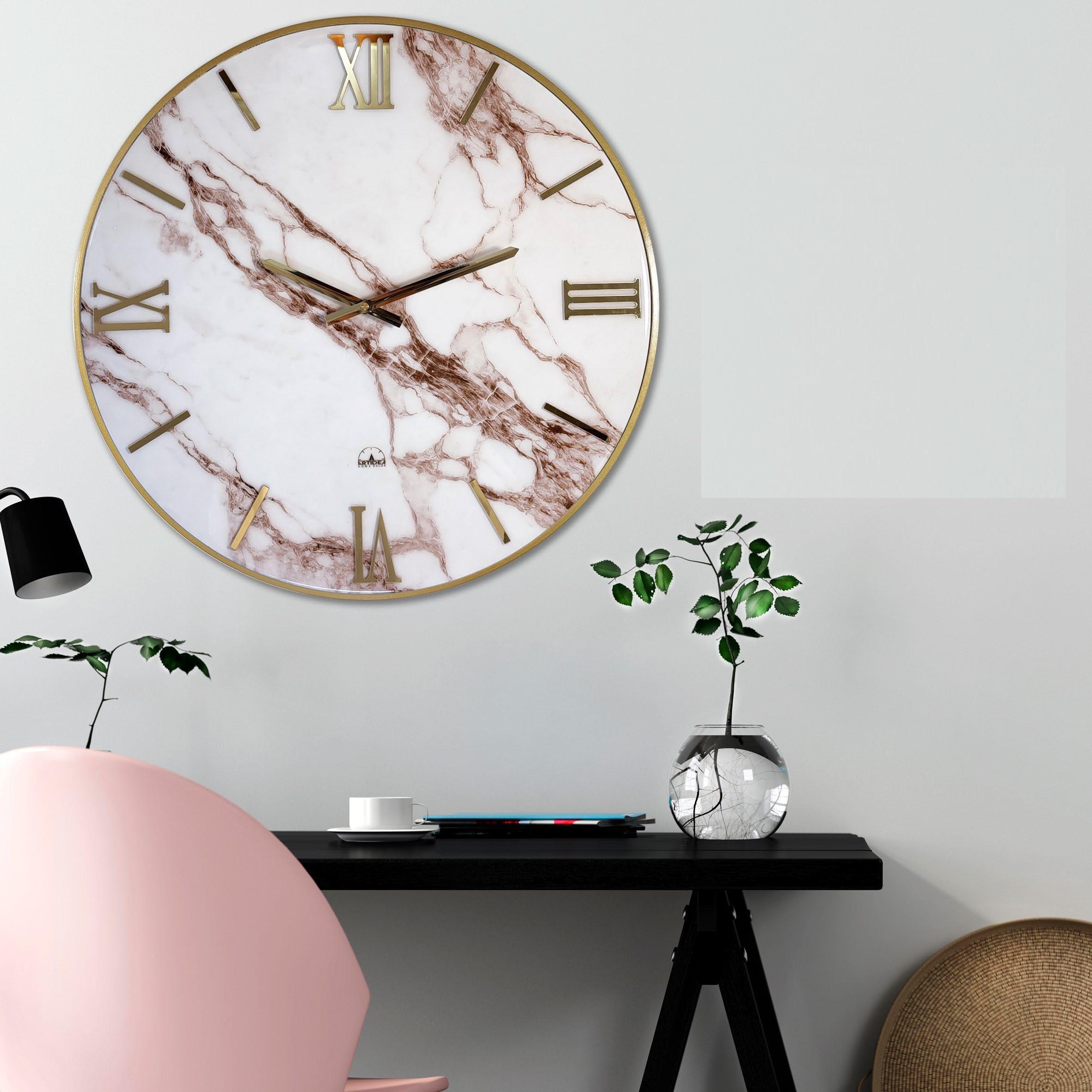 Orologio circolare con quadrante lucido, decorato a mano con foglia oro e numeri sovrapposti in Plex lucido con effetto specchio.