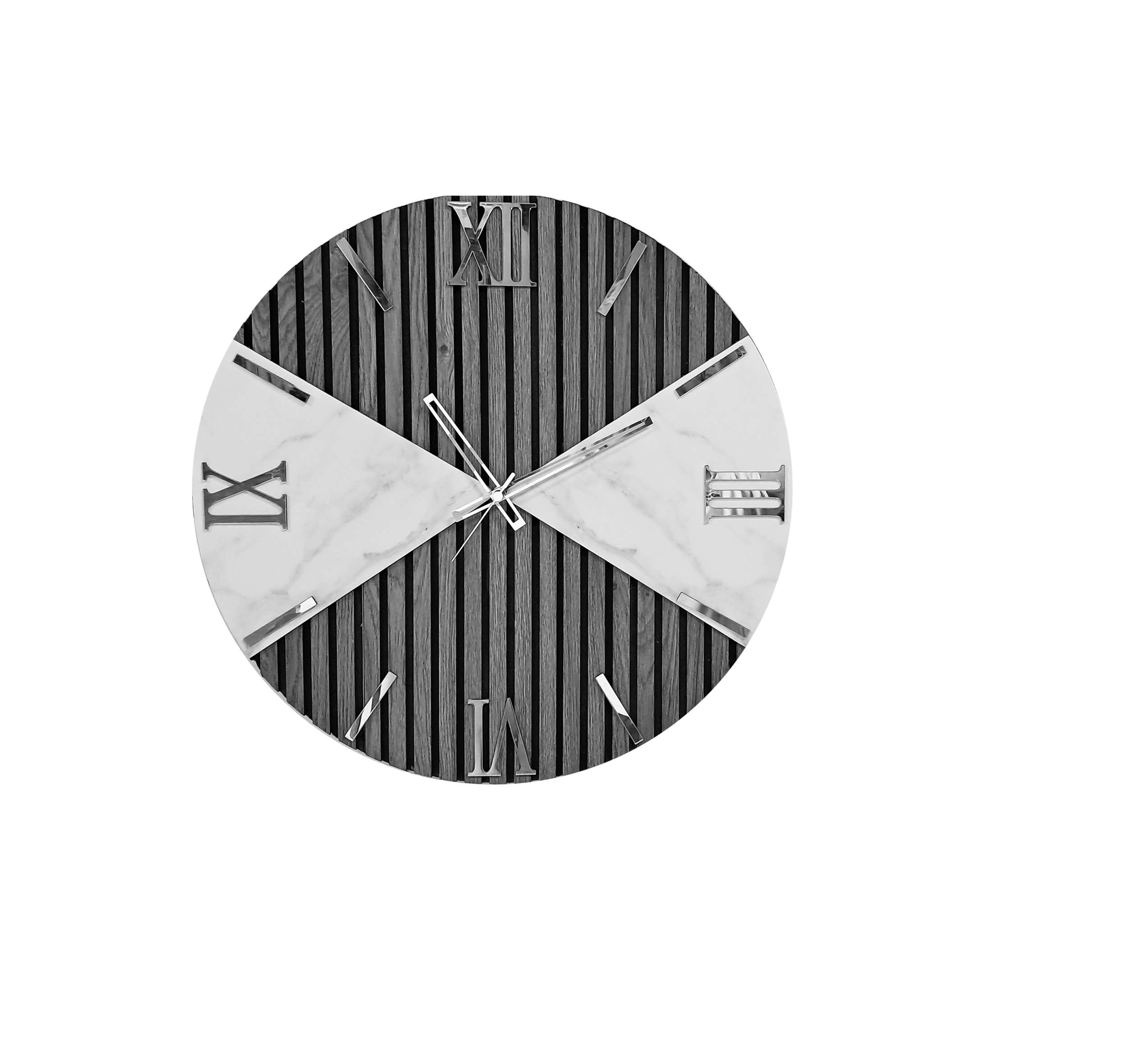 orologio moderno rotondo in legno cannettato fumè con dettagli marmorizzati