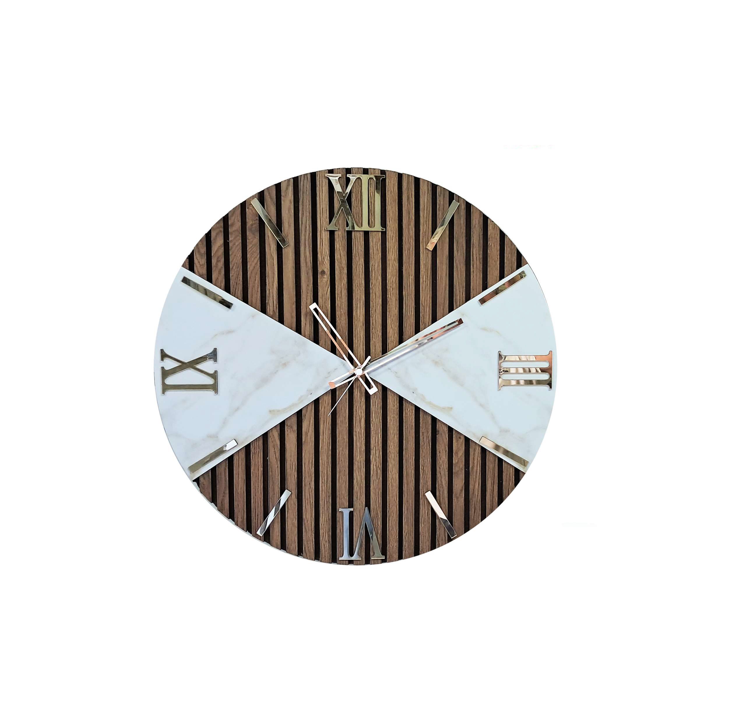 orologio moderno rotondo in legno cannettato marrone con dettagli marmorizzati