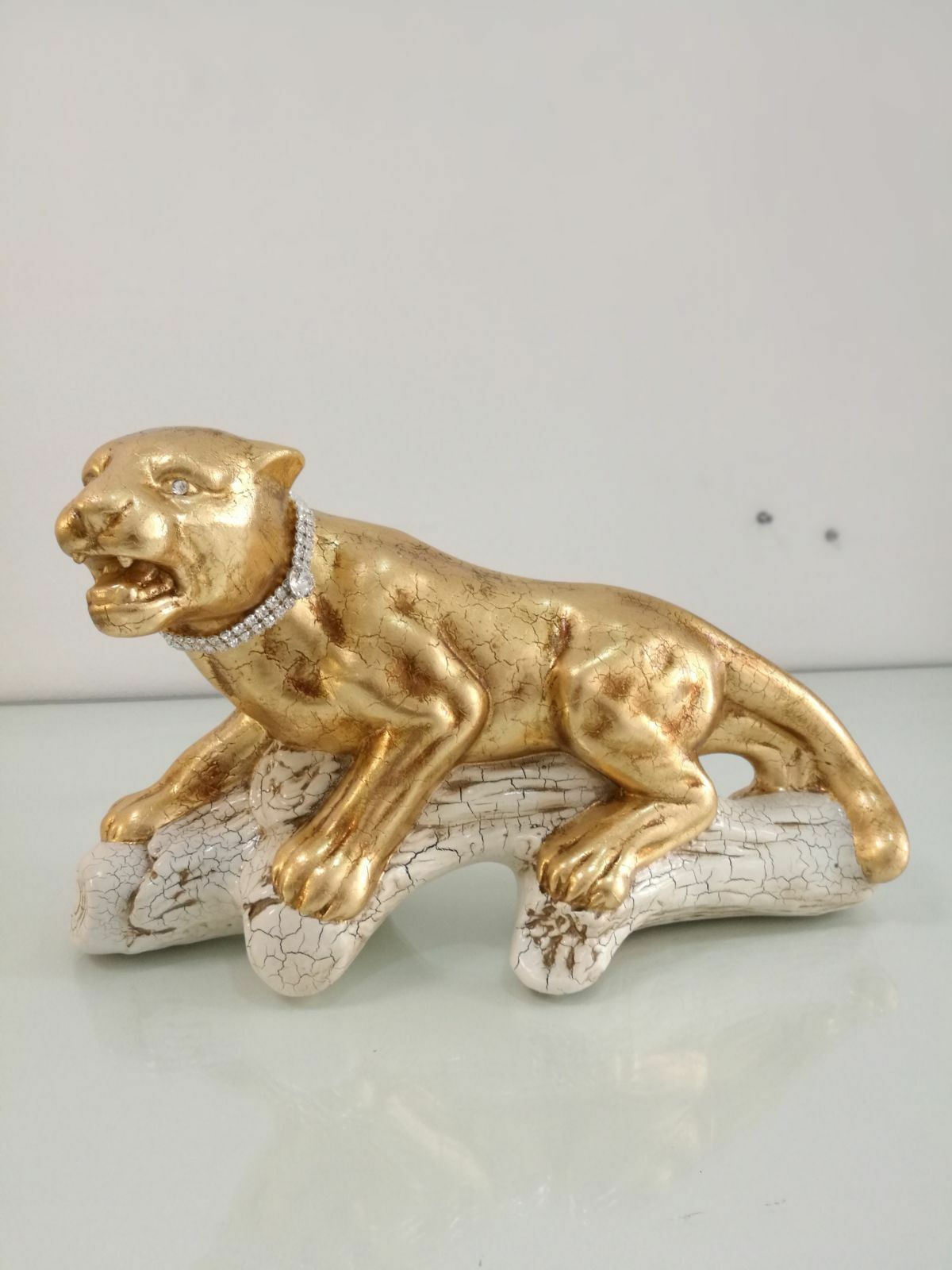 PANTERA PICCOLA SU TRONCO IN CERAMICA FOGLIA ORO COLLARE E OCCHI IN CRISTALLI