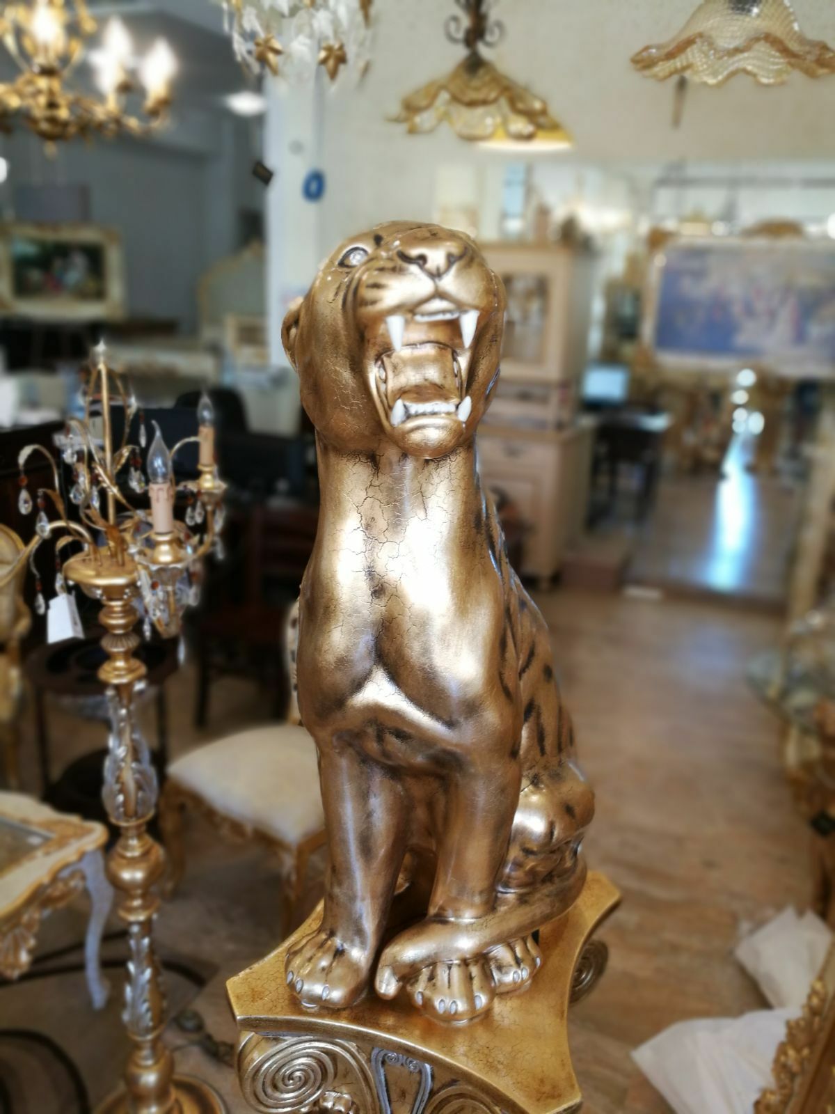 PANTERA SEDUTA IN CERAMICA DECORO FOGLIA ORO CON OCCHI IN CRISTALLO ARREDO CASA