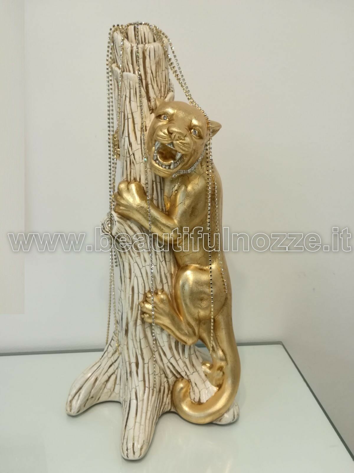 PANTERA SU TRONCO IN CERAMICA AVORIO E FOGLIA ORO CON CASCATA DI CRISTALLI