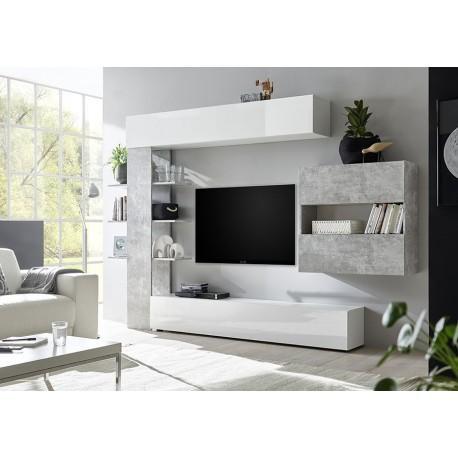 Parete attrezzata in finitura Bianco Laccato lucido e Beton. Ricca di elementi e dalle geometrie decise questa soluzione regala dinamicità e un ambiente di classe. Una composizione elegante e moderna che vi permetterà di ricreare un soggiorno dal design unico e di stile sfruttando al minimo gli spazi. Moderna e capiente è perfetta per trovare posto a tutti gli oggetti che non hanno una giusta collocazione.