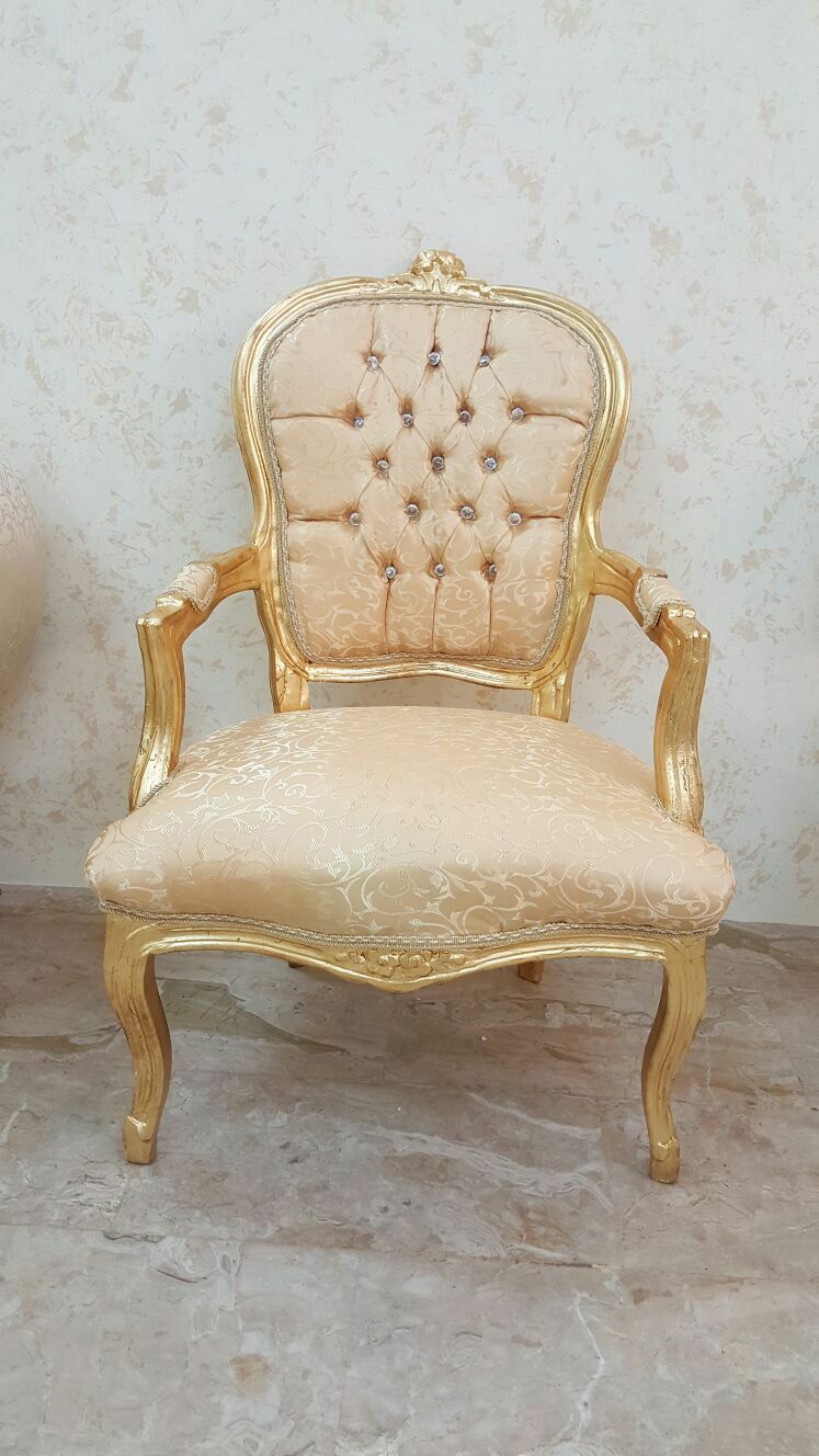 POLTRONA SEDIA CON BRACCIOLI IN LEGNO FOGLIA ORO STOFFA CON CRISTALLI