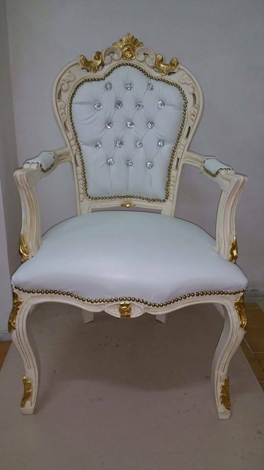 POLTRONA SEDIA CON BRACCIOLI IN LEGNO PANNA ORO ECOPELLE BIANCA CON CRISTALLI