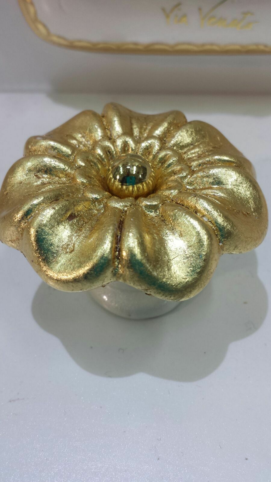 Copri interruttore a 7, copri interruttore a 3 e pomello, linea Perla, in ceramica avorio e foglia oro. Linea Via Veneto.