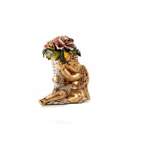 PUTTO ANGELO SEDUTO CON CORNUCOPIA FIORI E CRISTALLI FOGLIA ORO SOPRAMMOBILE