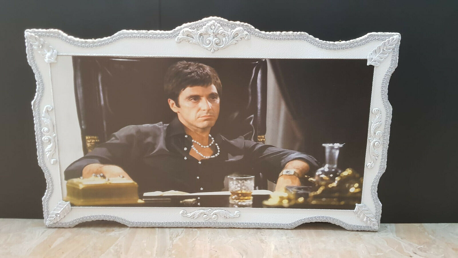 QUADRO CON AL PACINO SCARFACE CORNICE IN LEGNO BIANCO E FOGLIA ARGENTO