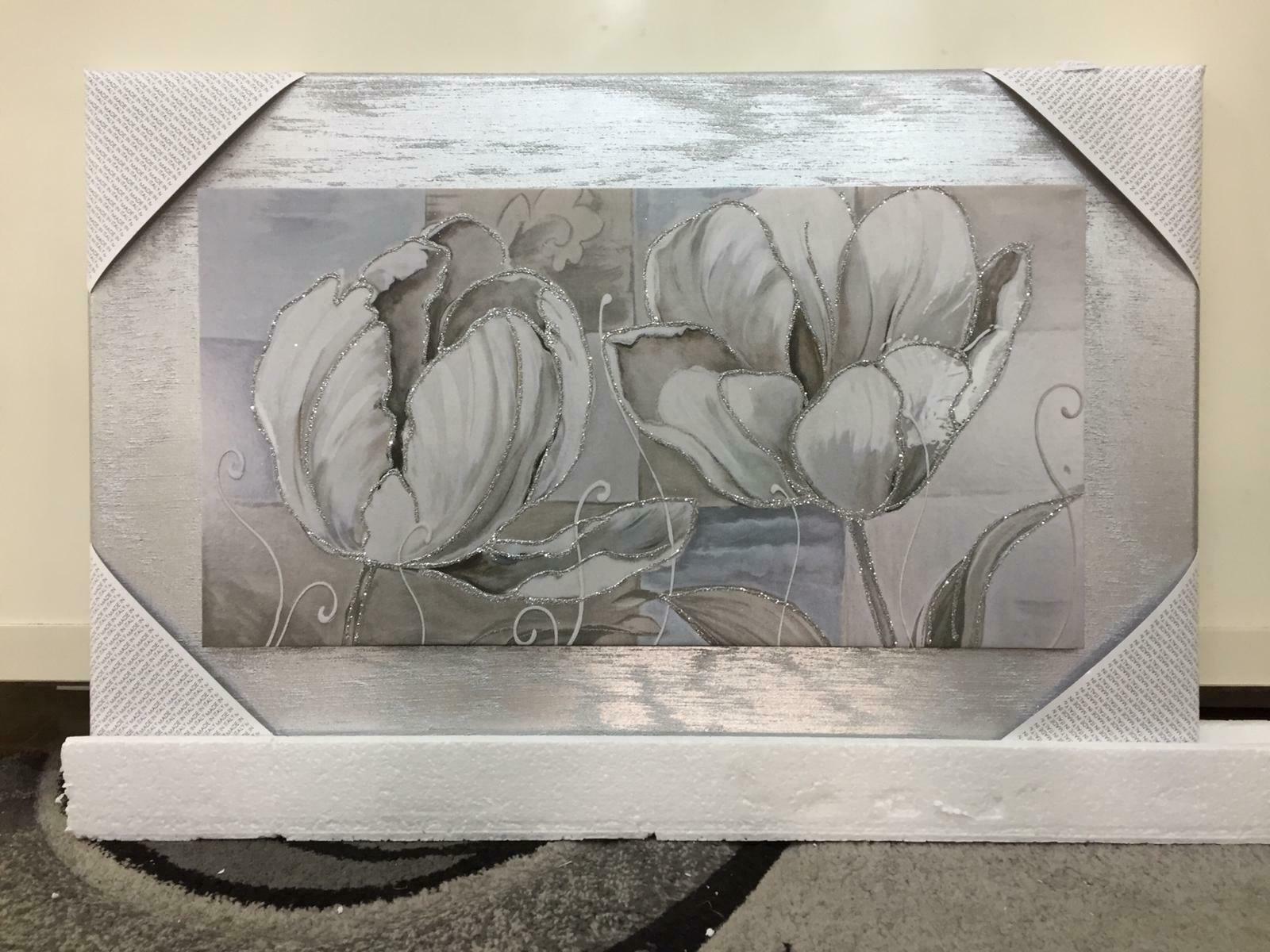 QUADRO MODERNO CON TELA A FIORI E GLITTER E CORNICE IN LEGNO ARGENTO