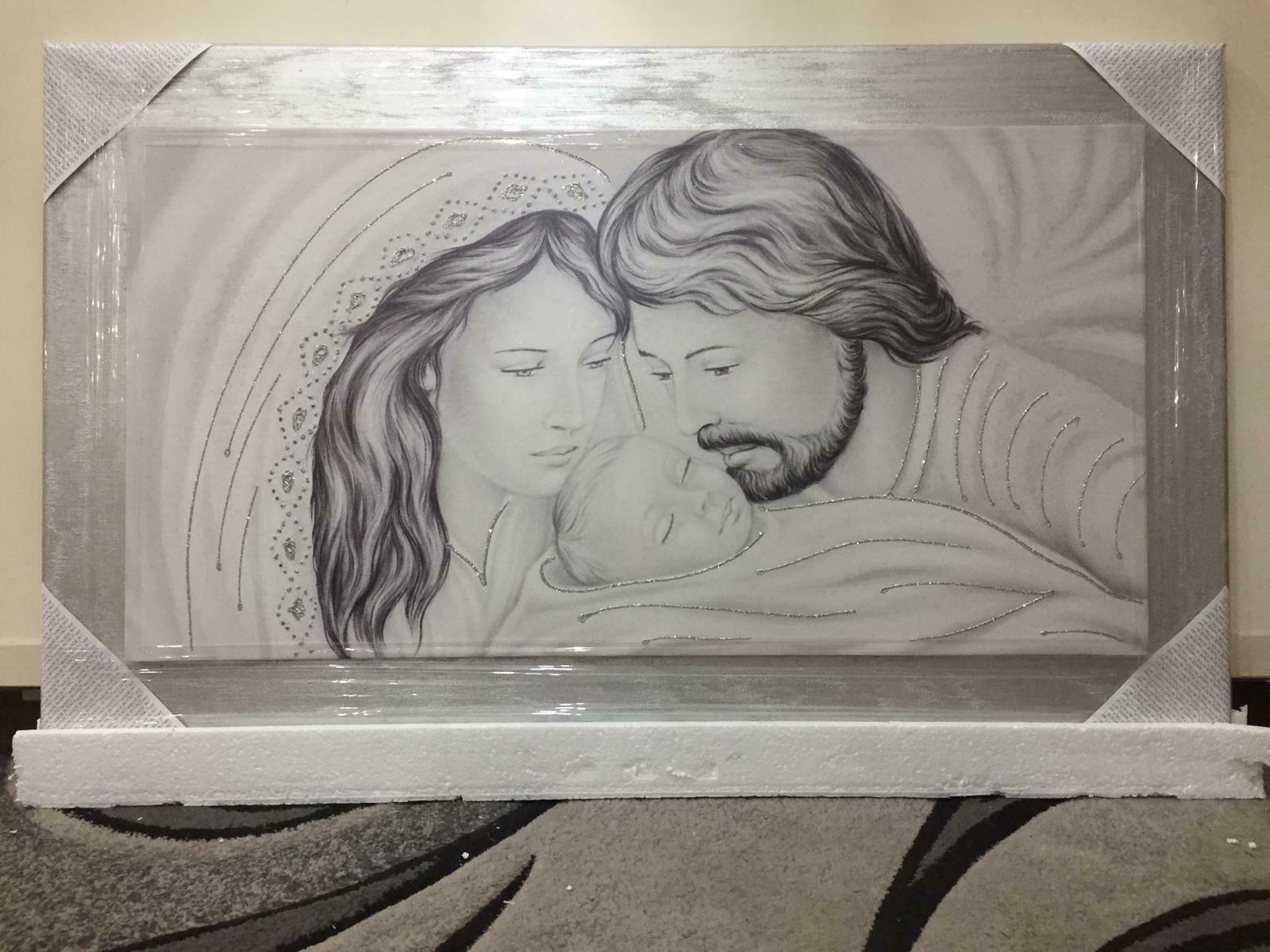 QUADRO MODERNO SACRA FAMIGLIA CON GLITTER E CORNICE IN LEGNO ARGENTO