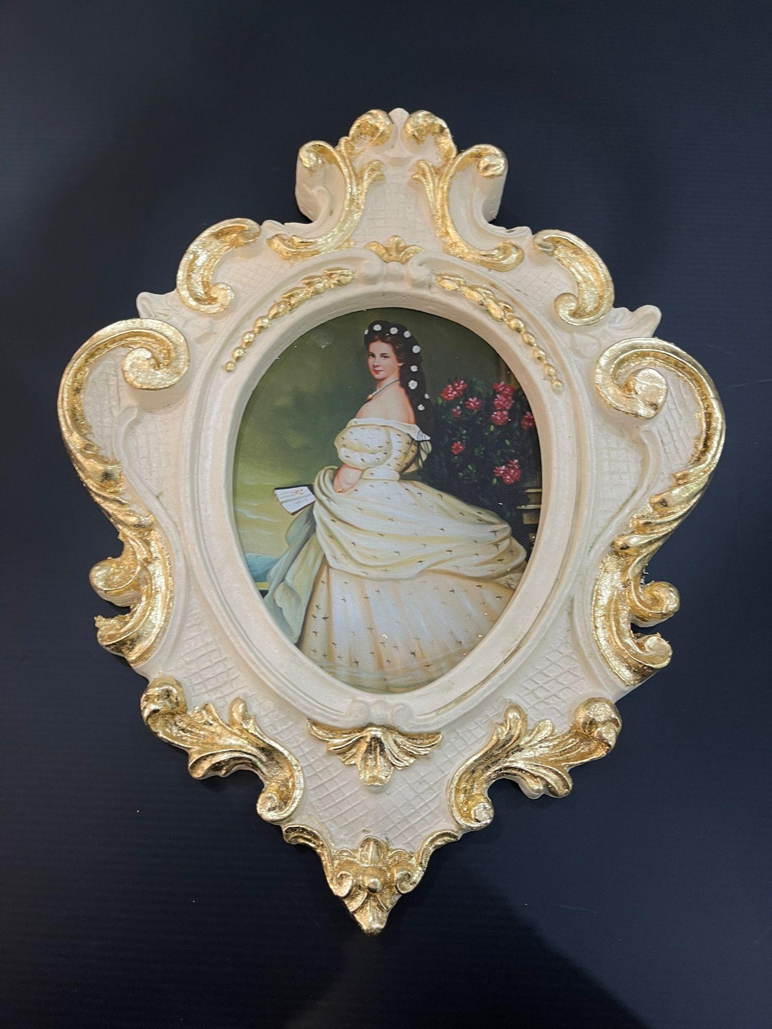 quadro ovale classico in legno avorio e foglia oro con dama H 37 cm