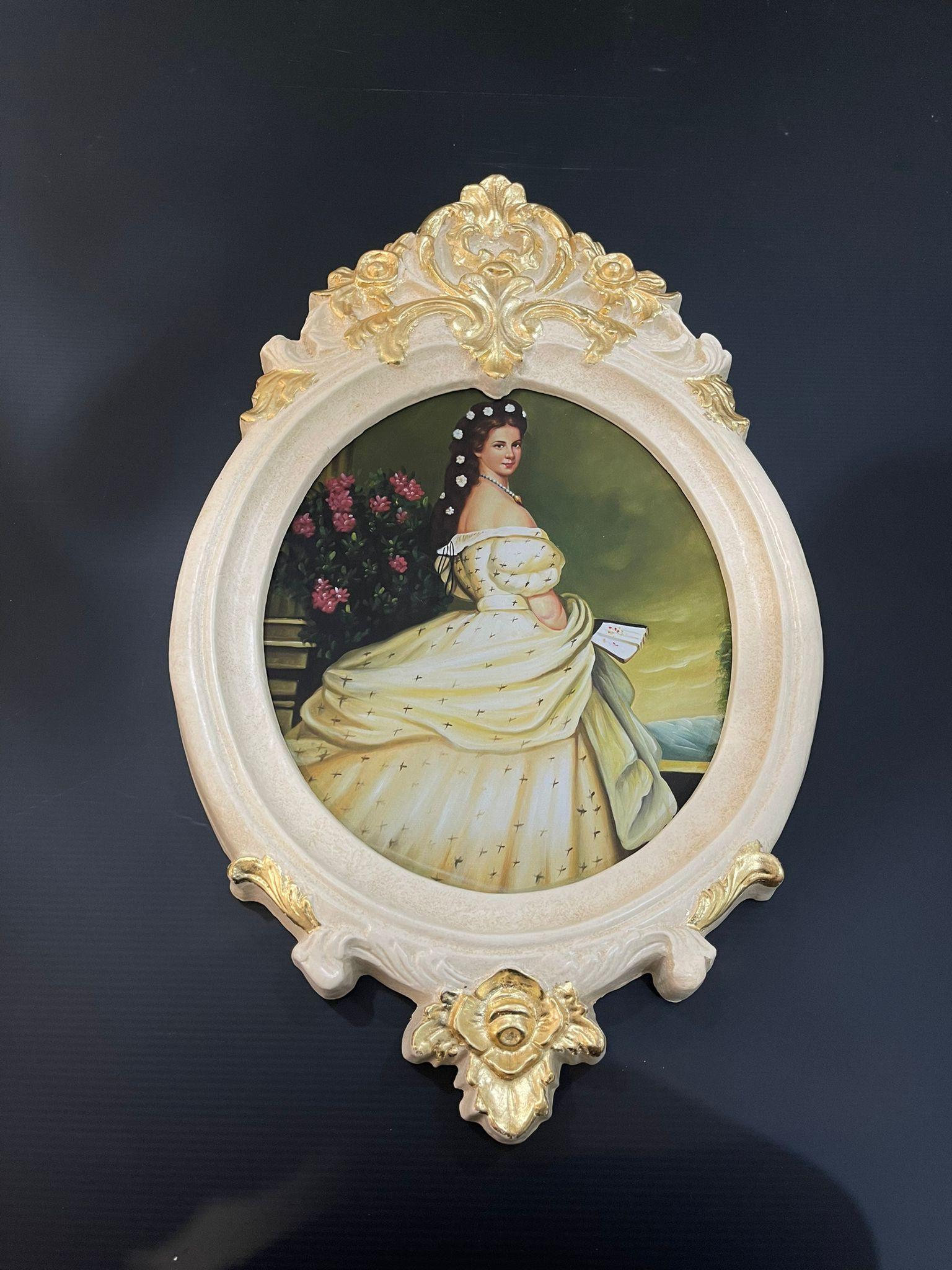 quadro ovale classico in legno avorio e foglia oro con dama H 55 cm