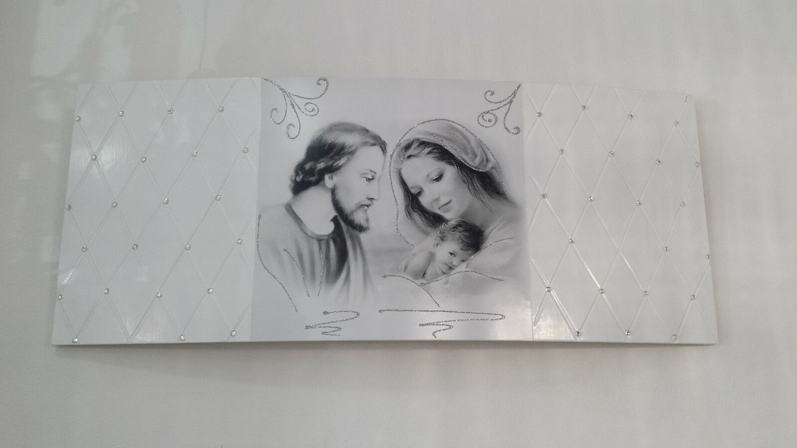 QUADRO SACRA FAMIGLIA BIANCO ARGENTO CRISTALLI IN LEGNO PANNELLO ARREDO CASA