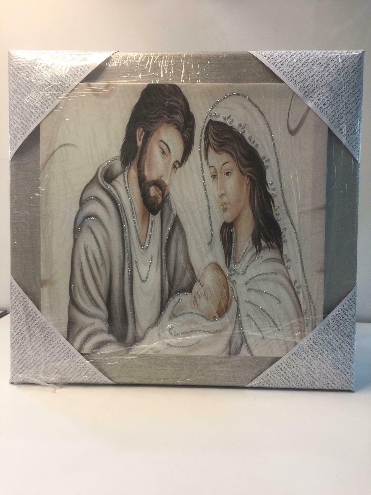 QUADRO SACRA FAMIGLIA CON CORNICE COLOR TORTORA E GLITTER ARGENTO 50×48 cm