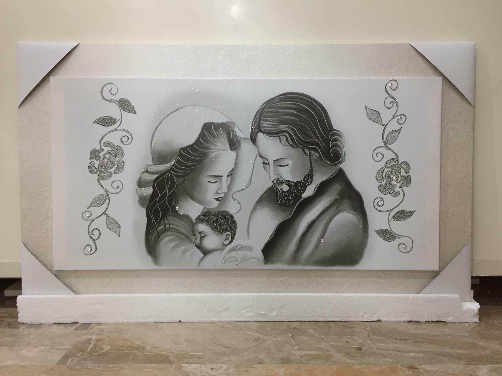QUADRO SACRA FAMIGLIA CON CORNICE IN LEGNO COLOR GHIACCIO E GLITTER 118×64 cm