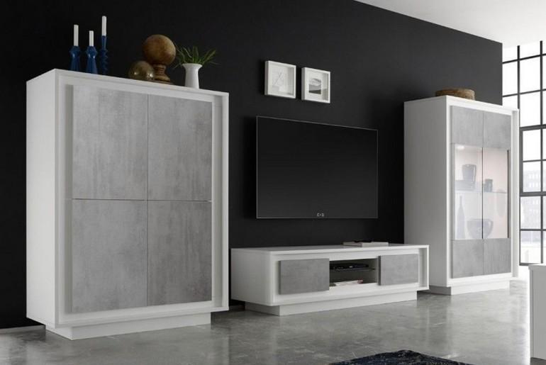 Parete attrezzata moderna Napoli Composizione Sky cemento composta da porta tv ,contenitore 4 ante , vetrina .tutto colore bianco larice e ante colore beton cemento.