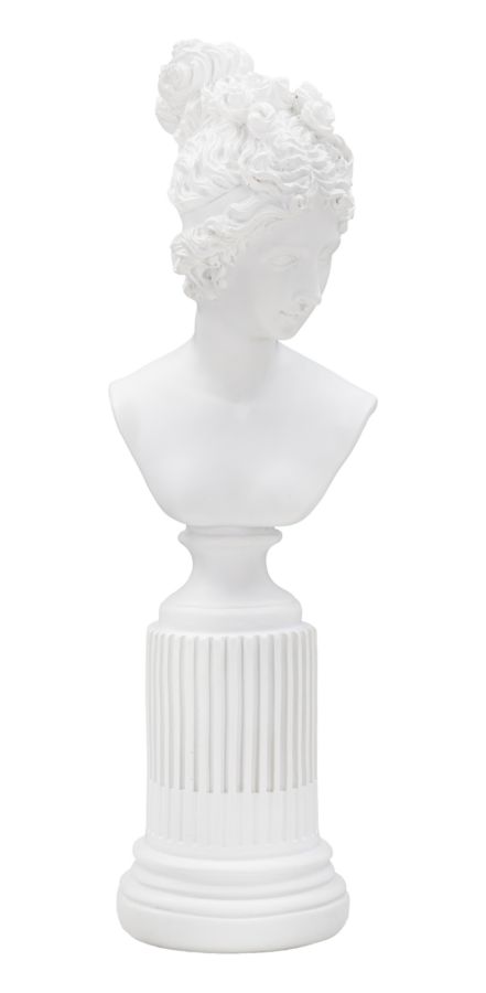 Elegante statua di busto di donna poggiato su di una colonna. Le linee richiamano l’arte classica.