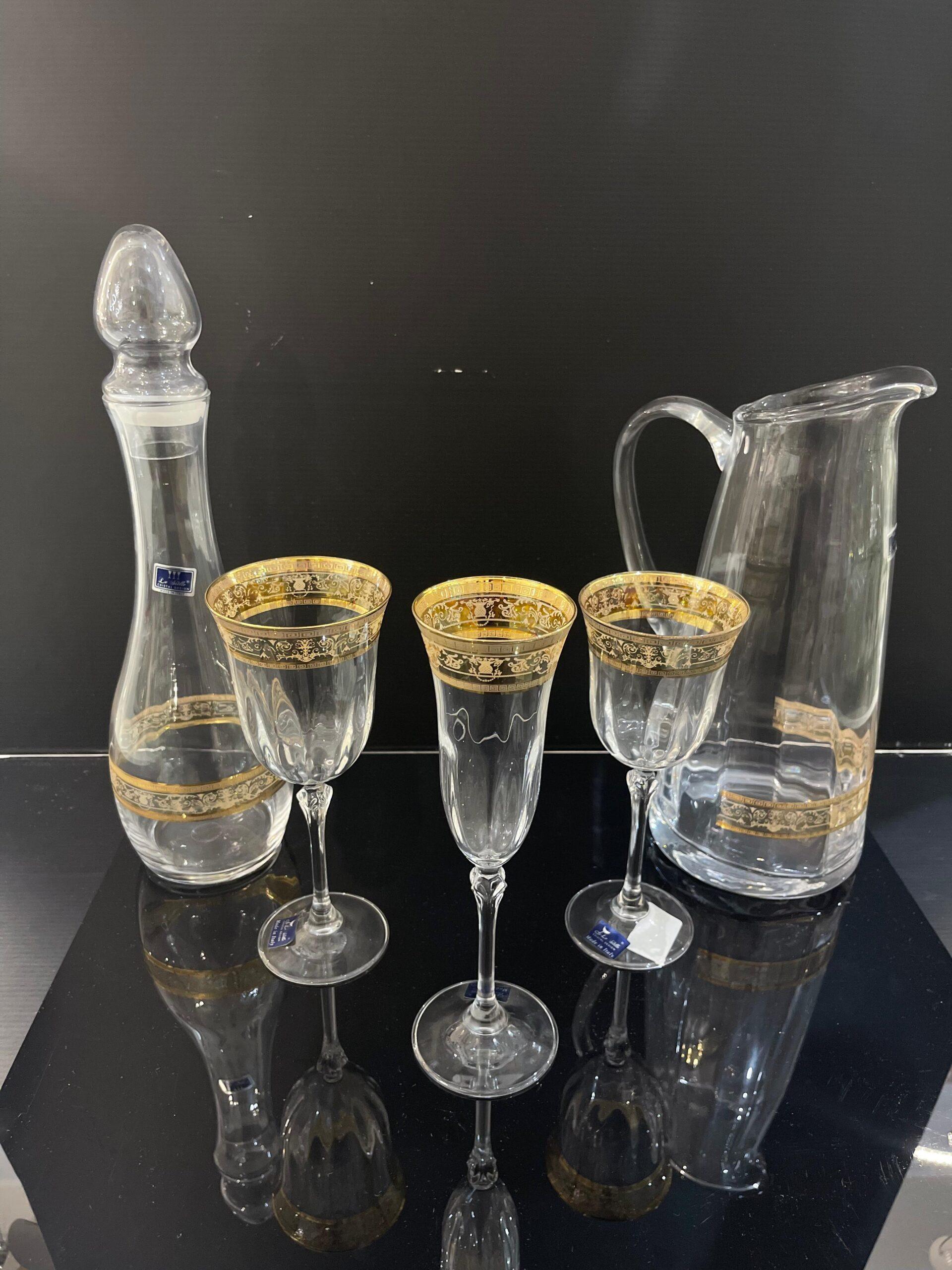 servizio di bicchieri in cristallo 38 pz decoro floreale inciso oro e filo oro