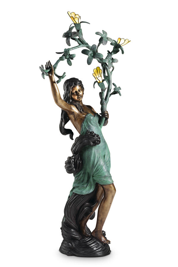 STATUA IN BRONZO DONNA CON PARALUMI TIFFANY MADRE PERLA