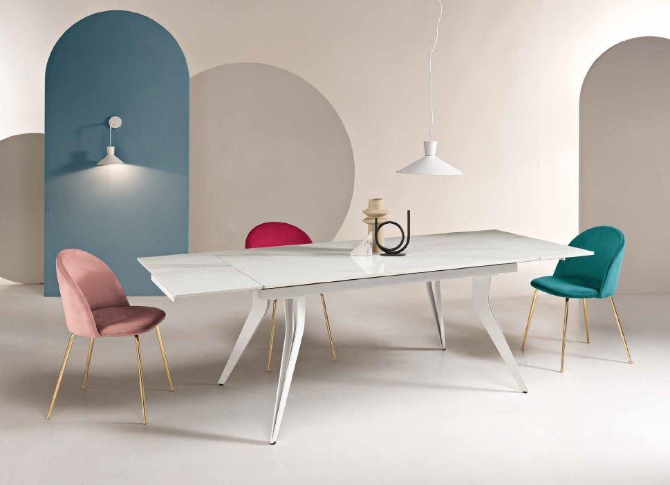 tavolo da pranzo moderno allungabile base bianca in metallo e piano in pietra effetto marmo bianco chiuso L 160 cm