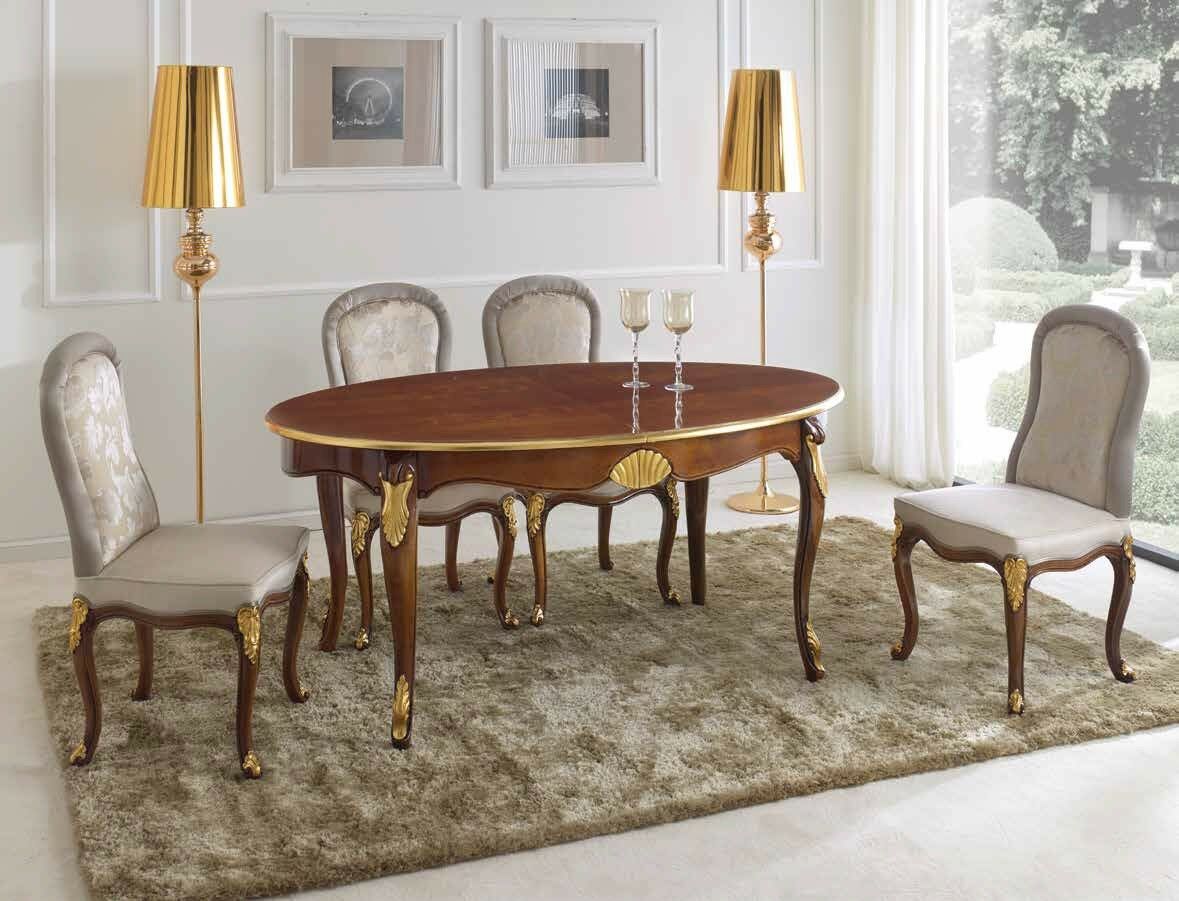 TAVOLO DA PRANZO OVALE ALLUNGABILE CON SEDIE E CAPOTAVOLA IN LEGNO NOCE E ORO